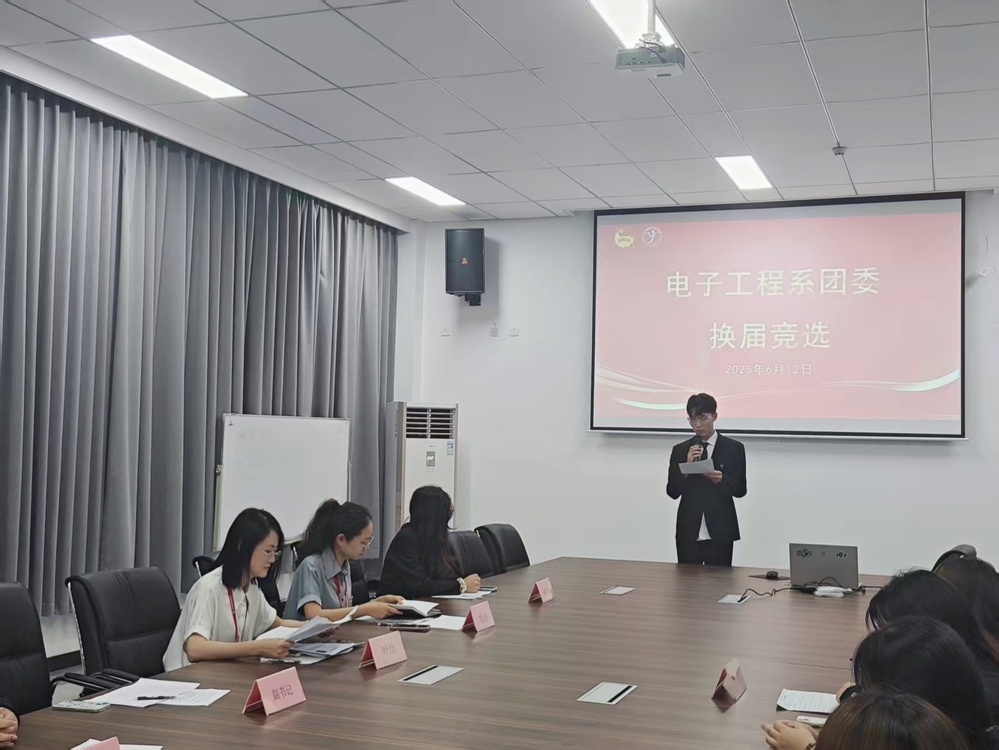为进一步加强电子工程系团委组织建设,激发青年学生骨干活力,2025年6月12日,电子工程系团委换届竞选大会在“一站式”学生社区慎学楼304举行。电子工程系党支部副书记叶绘、团委书记魏澜出席此次竞选大会,团委各部门学生干部参加大会。