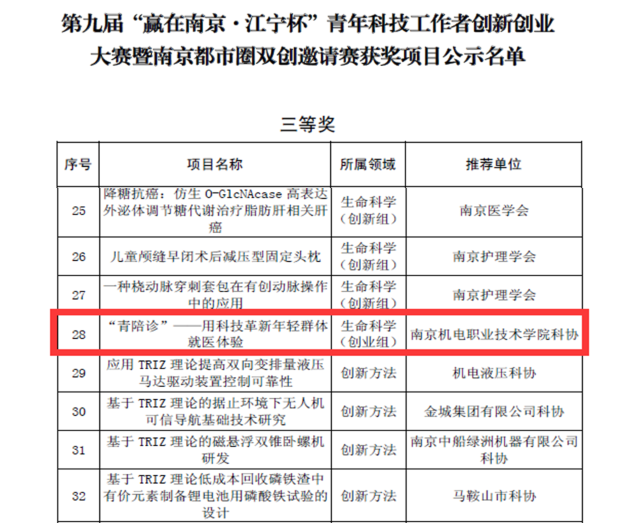2025年8月22日,在第九届“赢在南京·江宁杯”青年科技工作者创新创业大赛中,电子工程系学生团队凭借创新项目“青陪诊——用科技革新年轻群体就医体验”脱颖而出,荣获大赛三等奖。该项目由学生张文逸、赵思涵共同完成,沈小军老师担任指导教师。
