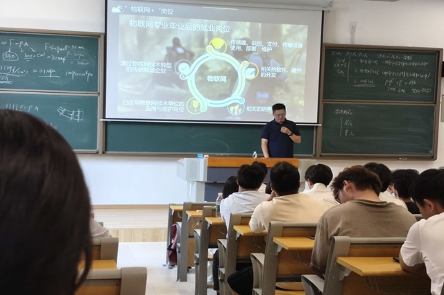 随后,新大陆时代科技有限公司总监周克龙结合行业前沿动态与企业实际项目,从多维度分享了物联网技术的知识体系与发展趋势。他通过具体案例,生动介绍了传感网技术、无线通信、数据分析及智能应用在实际场景中的运用,让新生直观感受到物联网技术在各行各业中的广泛影响和强大效能。在谈及就业前景时,周总监展示了从物联网设备安装调试员到物联网系统架构师等多样化的职业发展路径,为同学们勾勒出广阔的发展空间与职业可能性,进一步激发了大家对专业学习和未来职业的向往与信心。