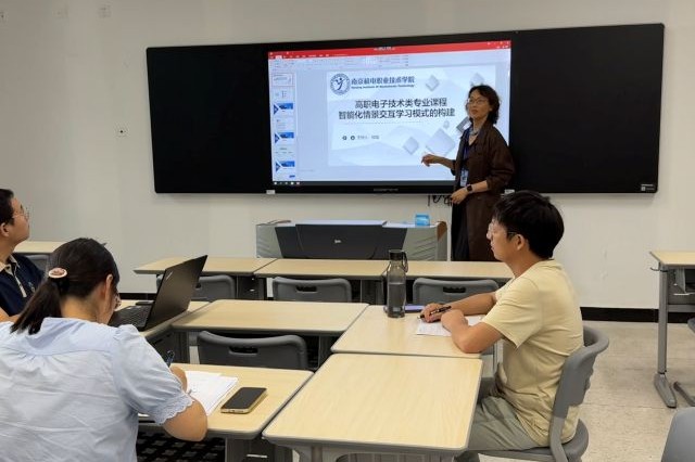与会教师围绕“如何构建智能化情景交互学习模式?”“如何利用虚拟仿真、增强现实(AR)技术创设学习情境?” “如何依托智能教学平台实现个性化学习?”等关键问题展开了热烈讨论。无人机应用技术专业王老师是新进教师,对虚拟仿真这方面比较擅长,本学期担任电工与电子技术的教学工作,他以“模拟电路故障诊断”为例,演示了通过虚拟仿真平台构建动态学习场景,引导学生自主探究解决问题的实践方案;智能产品开发与应用专业负责人张老师则分享了基于AR技术的电路装配交互实训设计,通过虚实结合增强学生的沉浸感和操作准确性。