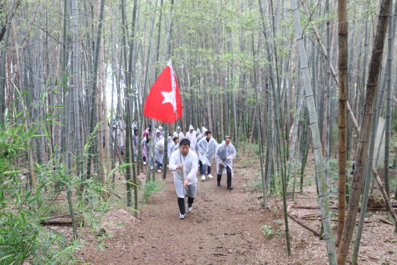 下午的“重走长征路”沉浸式学习体验在细雨中进行,别有一番深意。全体党员沿着精心设计的路线,模拟红军长征的重要节点。雨中的“雪山”更显陡峭,湿滑的“草地”更添艰难,虽不及当年万分之一艰险,却足以让人管中窥豹,感受那段气吞山河的壮丽史诗。在教练的精心设计下,四组党员分为两路,沿不同路线迂回挺进。互相呼应,协同前行,最终在预定地点胜利会师。那一刻,雨水与汗水交织,紧紧相握的双手与激情澎湃的拥抱,凝聚起两系党支部无坚不摧的奋进合力,更象征着在共同的理想信念下,所有征程终将通向辉煌的胜利。