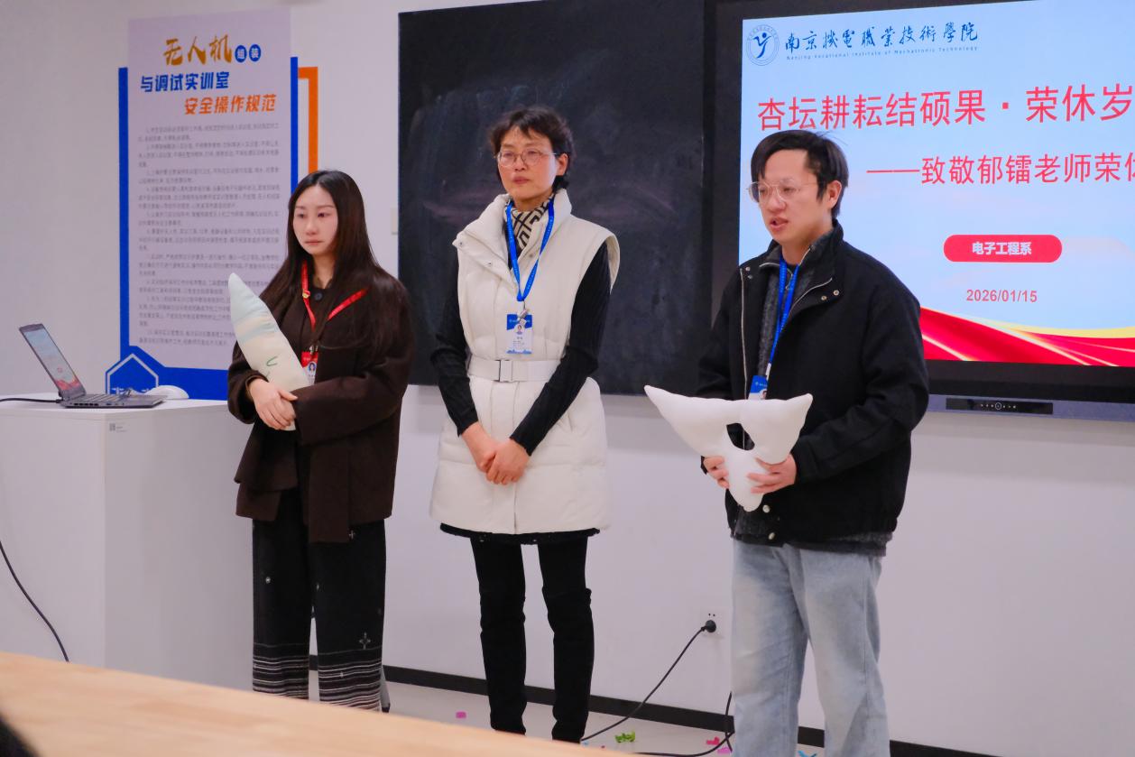 杨春雷主任、吴伟萍书记先后发言,回顾了郁镭老师在系部发展历程中的坚守与付出,言语间满是深厚情谊,同时送上对其退休生活的美好祝福,让现场氛围愈发温馨感人。随后,姚小冬主任上台致辞,代表学院对郁镭老师的工作给予高度肯定,既赞扬了她数十年如一日的敬业精神,也表达了对电子工程系教育事业薪火相传、蓬勃发展的殷切期望。