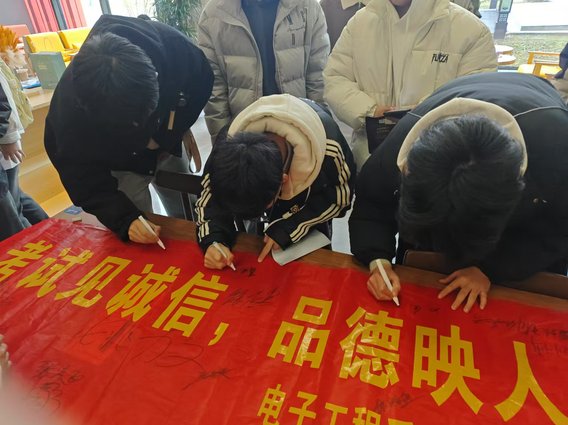 随后,在全体师生的见证下,洪苏珊带领电子工程系的学生们逐一上前,在横幅上郑重签下自己的名字,每一个笔画都凝聚着学生对诚信的承诺与尊重。这一刻,不仅是对即将来临考试的庄严承诺,更是对自己未来人生的负责态度。