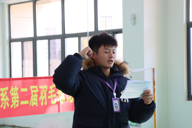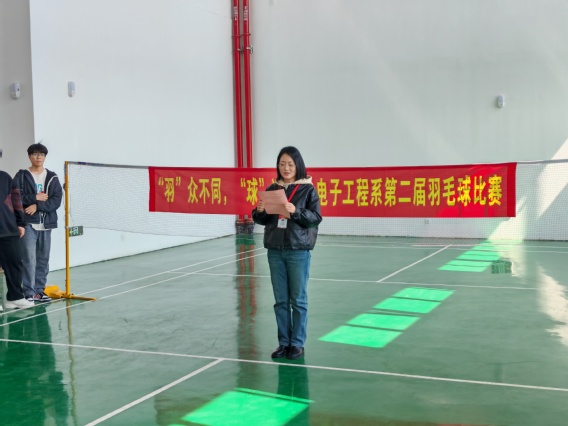 主持人依次介绍出席领导与嘉宾后,现场响起热烈掌声。叶绘代表系关工委致辞,指出:“羽毛球比赛不仅是竞技舞台,更是展现电子工程系师生团结协作、勇于拼搏精神的窗口。希望选手们以球会友、赛出风采,裁判员秉持公正,共同谱写‘友谊第一,比赛第二’的体育篇章。”