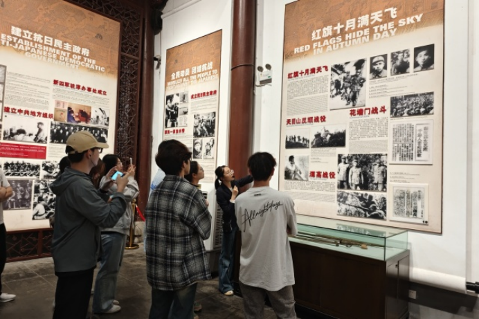 参观过程中,通过讲解员生动且详细的介绍,大家了解到新四军第一支队司令员陈毅、傅秋涛等老一辈革命家在此指挥,建立以茅山为中心的抗战根据地的故事。同学们仔细聆听着讲解员的解读,注视着场馆内新四军浴血奋战时所使用的武器和一张张记录着革命先烈辉煌历史的照片,深刻感受到革命家为解放事业所做的伟大贡献和巨大牺牲,也被战士们勇往直前,顽强抗战的勇气和坚定力量所震撼。