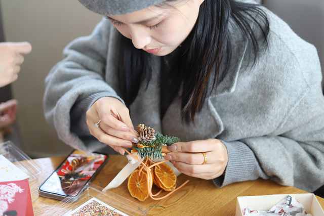 活动现场,空气中弥漫着橙子、肉桂的独特香味,在专业老师的指导下,老师们齐聚一堂,欢声笑语,看似小小的一个挂件,所用到的材料却不少。在李老师的讲解下,老师们小心翼翼地把10个橙片挨个开孔,按中间大两边小排序,用鹿皮绳穿好打上结,紧接着再把串好的橙子和肉桂用热熔胶进行连接,粘上小蝴蝶结点缀,等热熔胶凝固后,再粘上诺贝松,松果子,乌臼果,一个既漂亮又香甜的挂件就做好了。看着手中慢慢变美的作品,老师们的脸上洋溢着快乐,享受着全身心的放松。