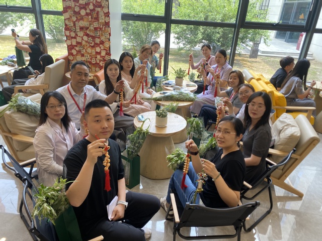 活动特邀专业手工老师现场指导,从艾草的挑选与修剪,到彩绳的编织技巧,再到竹筒与香囊的搭配艺术,老师耐心讲解、亲身示范。教职工们全神贯注,紧跟指导步骤,同时大胆发挥创意:有人将艾草与彩绳编织成精致的花束,有人在竹筒上系上象征平安的葫芦,还有人用香囊缝制出独一无二的端午挂饰。现场气氛热烈,欢声笑语不断,大家在动手实践中感受着传统手工艺的魅力,也在相互交流中增进了情谊。