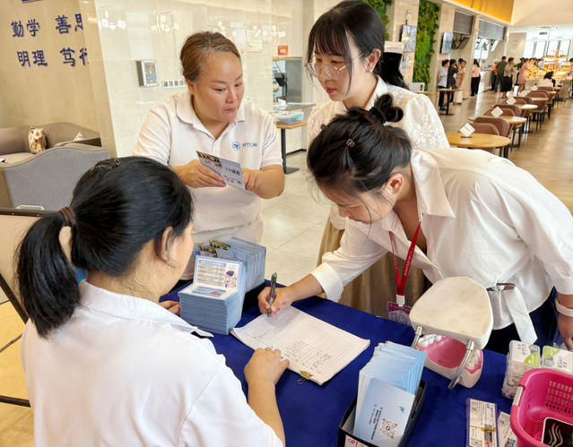 午休时间,学校食堂内的“教师节口腔义诊专区” 热闹起来。为关注教师身体健康,学校工会特别邀请了专业口腔医疗团队入驻校园,为老师们提供免费口腔检查、口腔健康咨询及护齿知识普及服务。义诊现场,医护人员耐心为老师们检查牙齿健康状况,针对龋齿、牙周炎等常见口腔问题给出专业治疗建议,并发放口腔护理宣传手册。“平时工作忙,很少特意去做口腔检查,工会这个活动太及时了,既了解了自己的牙齿情况,还学到了护齿知识,真是一份特别的节日‘健康礼’” 。参与义诊的老师纷纷点赞。