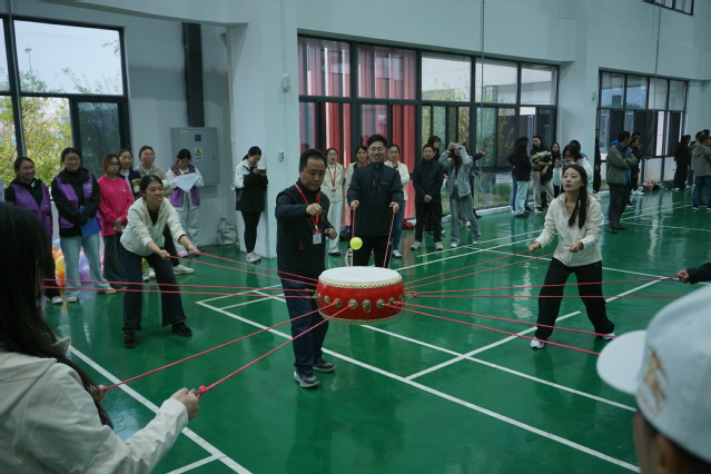 鼓韵齐鸣场地中,当球被放在鼓面中心,大家迅速调整力度,齐心协力拉动绳子,让球在鼓面平稳颠起。2 分钟内累计的有效次数,是团队心往一处想、劲往一处使的最佳证明。