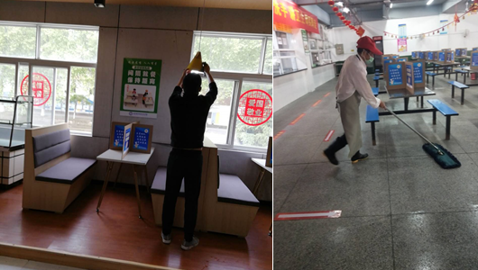 为了保障食品安全,让师生们返校能够吃的安心、吃的健康,后勤处组织员工,提前对食堂内外环境进行全面清洁消毒。