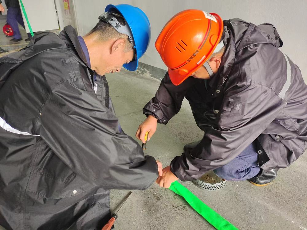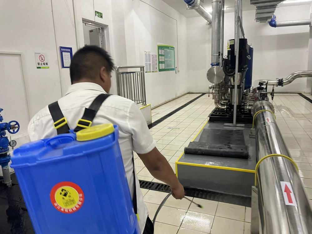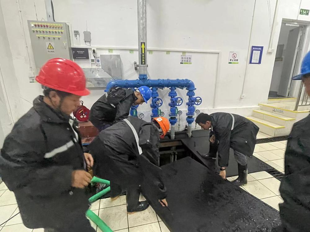 7月6日,地下室模拟暴雨积水倒灌,随时危及生活泵房的正常运行。演练开始,维修人员立即采取措施,调集移动应急抽水泵抽水、搬运应急沙袋垒在坡道处减少雨水倒灌、打开积水处窨井盖排水并在泵房积水排完后及时进行彻底的卫生处理、消毒。