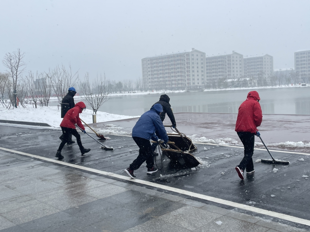凛冽的寒风阻挡不了劳动的热情,学校进出大门口,校园主干道路,教学楼周边,宿舍楼周边,到处都是物业工作人员扫雪除冰的身影。