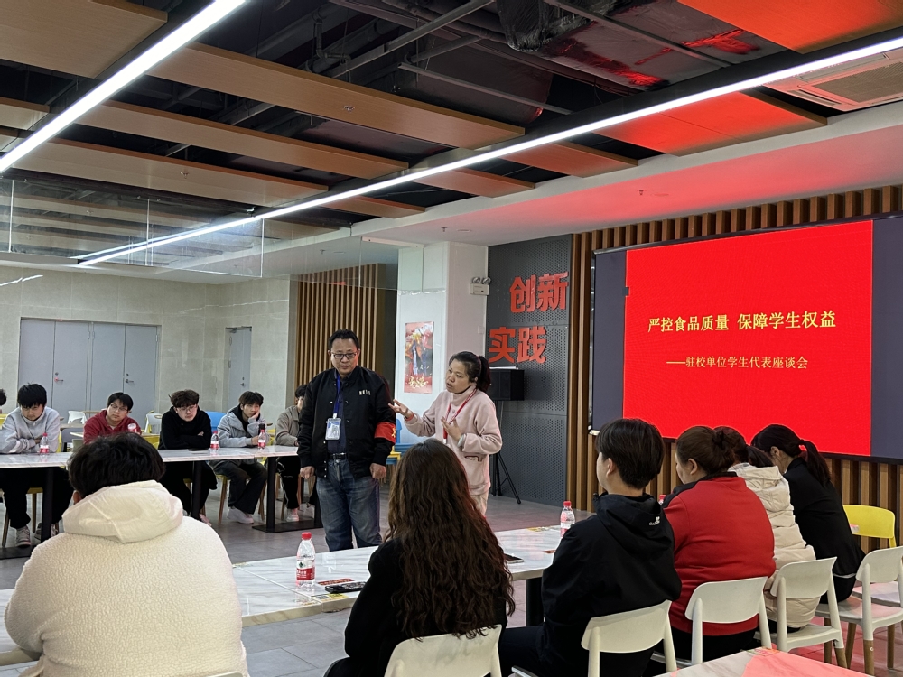 为确保学生购物饮食健康安全,更好的维护学生合法权益,建立良好的沟通渠道,切实解决学生生活方面存在的问题,后勤处组织各驻校经营单位负责人及学生代表于3月19日下午在一楼食堂召开生活座谈会,后勤处副处长孙永玲、周涛主持会议,一楼食堂、二楼食堂、华联超市三家驻校经营单位负责人及各院系30名学生代表参加会议。