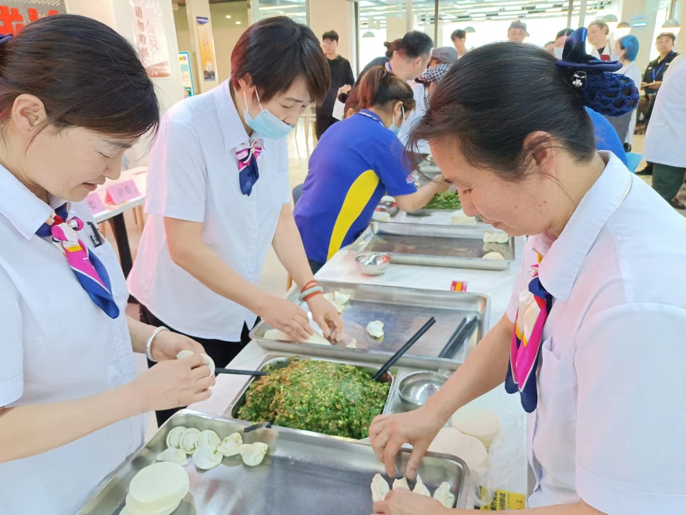 本次比赛设置了包饺子、打菜一勺准、水果拼盘、厨艺大比拼、算账一口清、托盘折返跑六个项目,随着比赛口令各参赛选手大显身手,争先恐后地展示服务技能和服务技巧,比赛现场气氛紧张激烈。