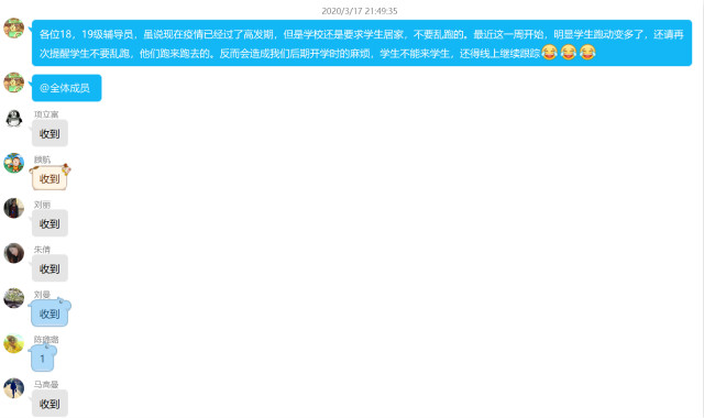 机械工程系学工团队也从1月27日起开始了网络办公,转眼间1个多月过去了。学生们虽然分布在五湖四海,但距离阻隔不了辅导员对学生关爱,辅导员们依旧坚持着每日一问,每日一查,每日一核,每日一报,时刻关注学生的动向,确保学生的安全。