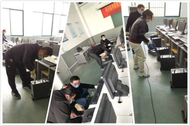 电脑长时间使用后,灰尘等污物会在机身内、外部积淀,阻塞散热孔,从而造成内部温度过高,影响设备使用寿命,甚至引发火灾。为消除隐患,除尘工作中老师们分工明确,不怕脏不怕累,干劲十足,李杰书记更是以身作则参与到除尘工作中。分别对计算机设备进行拆卸、计算机内部除尘、键盘和桌面除尘、计算机设备安装,实验室卫生保洁等工作。