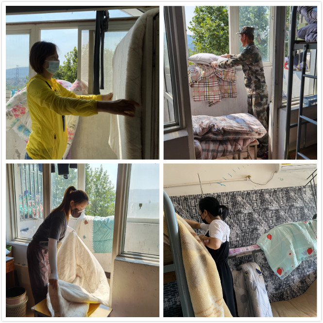 在学生宿舍楼下,机械工程系党支部副书记李杰正给全系老师们分工分组,老师们要负责将学生的被褥分批拿到空旷的地方进行晾晒,并做好标记,晒完后再放回原处,尽可能保证原样。 活动一直进行到下午3:30,系主任佟静带着老师们挨个检查完宿舍方才结束。