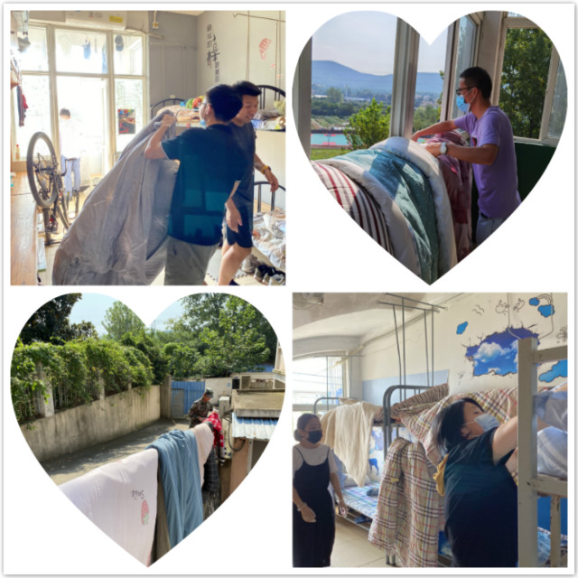 2020年9月4日上午9:00,机械工程系全体教职工自发组织开展了替学生晒床褥被子的活动,随着开学时间的临近,系党支部为保障开学后学生的身体健康和睡眠质量,动员全系教职工参与到此次活动中。