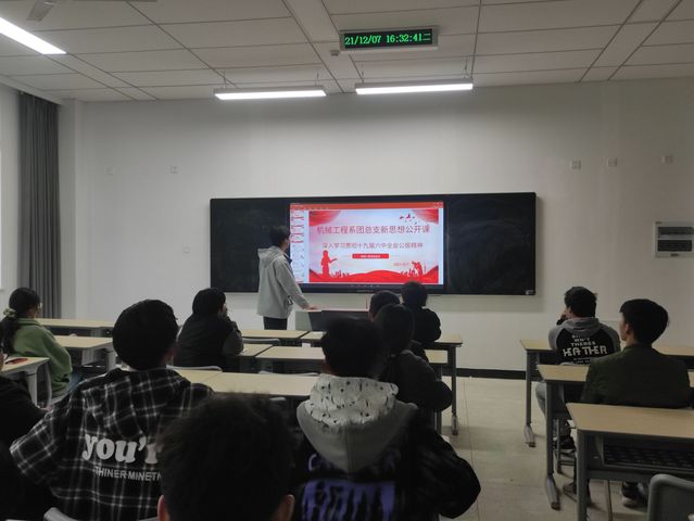 机械工程系团总支为更好的学习和贯彻十九届六中全会精神,于12月7日开展新思想公开课暨十九届六中全会精神学习。新思想公开课由团总支副书记李华润主持,团总支人员及21级班长参加此次公开课。同时也为提高广大学生干部的工作能力,团总支于12月5日、9日开展线上学干培训。