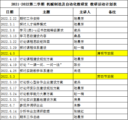 最后,我们从专业建设任务中整理出本学期教研活动计划,并明确每次教研活动的工作要求。比如“探讨人才培养模式”,主讲人需要学习、收集、整理同行院校的各类人才培养模式,总结各自的特点,然后在教研活动中和教研室成员一起分享、交流,讨论专业现有人才培养模式是否需要改进或调整。即每次教研活动均需要有前期的学习、教研活动中的讨论、以及最后的结论。希望全体教师认真对待、团结协作,为专业建设贡献自己的力量。