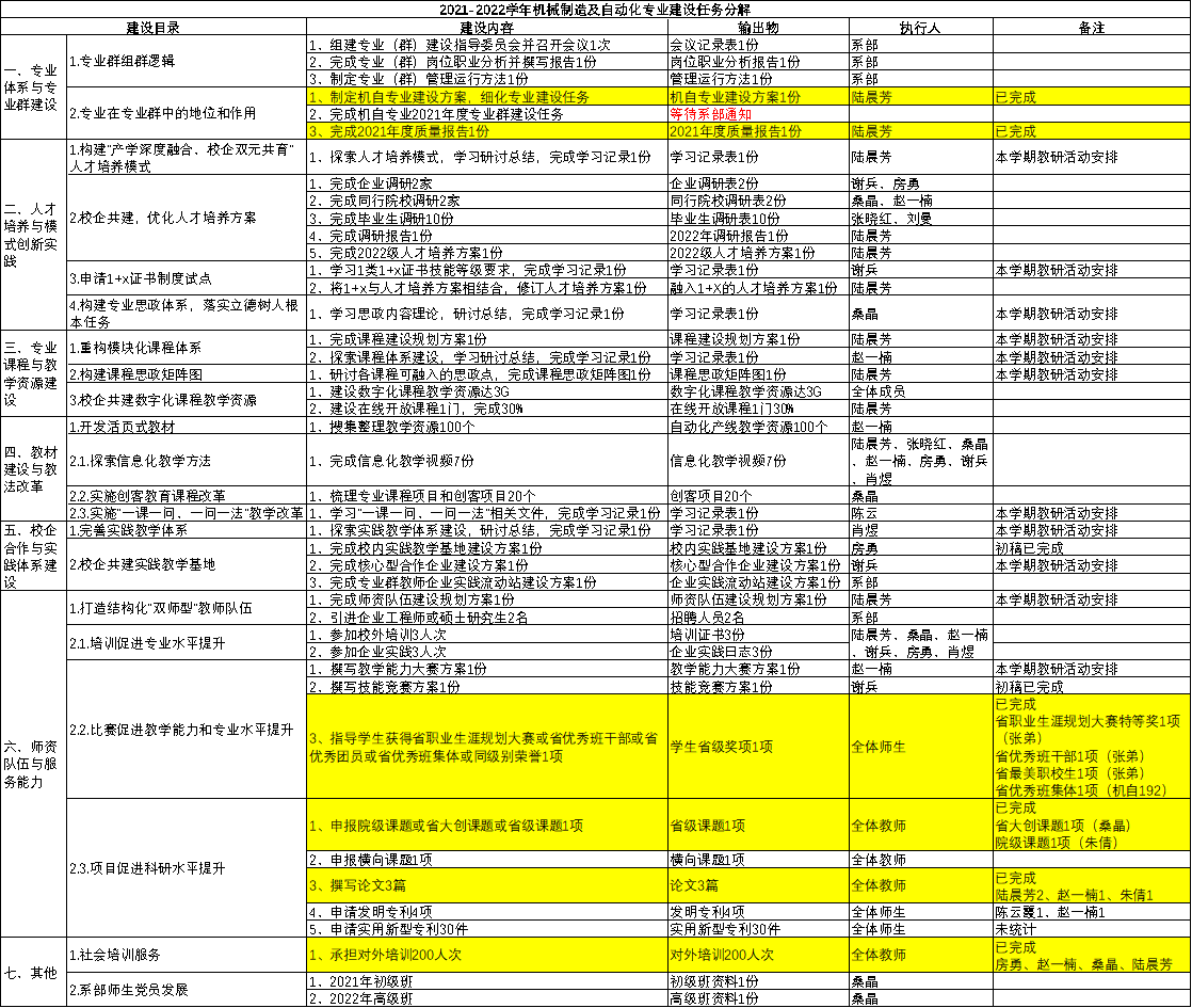 其次,各教研室分组讨论本学期专业建设任务。根据“十四五”专业建设规划方案,整理哪些任务已完成、哪些任务未完成,针对未完成的建设内容,明确输出物和执行人,并逐一讨论如何完成各项建设任务。