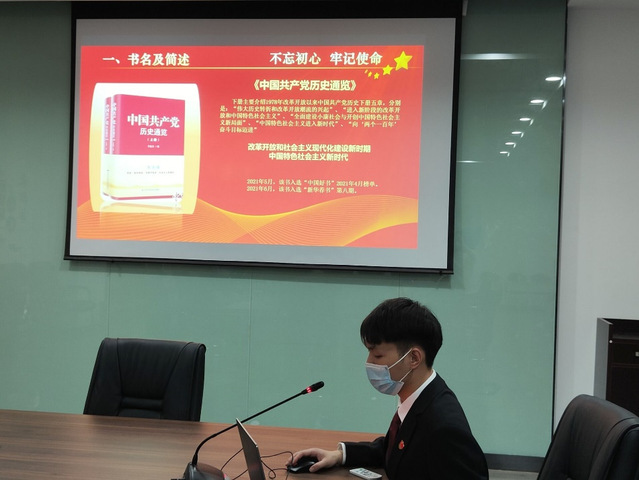 分享会上,学生党员朱子豪分享了《中国共产党历史通览》这本书,他介绍了中国共产党百年奋斗史的四个历史时期,分别是新民主主义革命时期、社会主义革命和建设时期、改革开放和社会主义现代化建设新时期、中国特色社会主义新时代。重温了一百年来,中国共产党始终同人民想在一起、干在一起,风雨同舟、同甘共苦、始终不负人民的伟大历史壮举。随后,全体党员分别围绕党史学习和读书心得进行了交流。最后,支部青年委员桑晶同志做总结发言,她表示此次读书分享会,为我们共同学习进步提供了一个很好的交流机会,既是一次学习的过程,更是一次心灵的洗礼。同时,她倡议下次活动由支委推荐优秀党史书籍进行分享,并勉励大家保持良好的学习习惯,多阅读党史类读物,凝聚共识、感悟初心、拓宽视野、增长见识、共同进步,进一步坚定理想信念,强化责任担当。