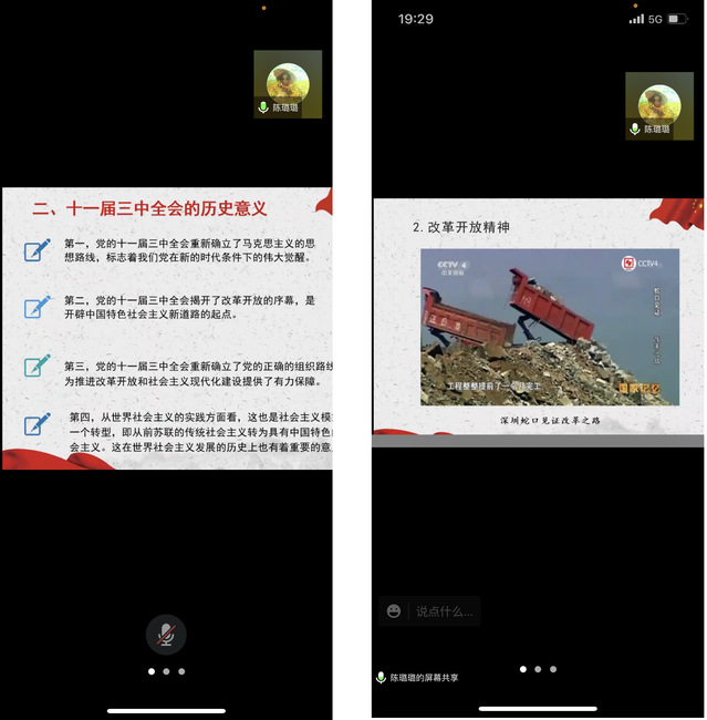 本次党课学习邀请思政中心陈璐璐老师主讲,她主要从三个方面来介绍。第一,十一届三中全会召开的背景。1976年10月粉碎四人帮文革结束,但当时中共中央主要领导人提出“两个凡是”的错误方针,维护和坚持“左”的错误,使党和国家的工作出现在徘徊中前进的局面。1978年真理标准问题的讨论,重新确立党的实事求是的思想路线为党的十一届三中全会的召开奠定思想基础。第二,十一届三中全会的历史意义。十一届三中全会是新中国成立以来党的历史上具有深远意义的伟大转折。全会结束了粉碎“四人帮”后两年在徘徊中前进的局面,开始了中国共产党在思想、政治、组织等领域的全面拨乱反正,形成了以邓小平为核心的党的中央领导集体,揭开了社会主义改革开放的序幕。以这次全会为起点,中国进入了改革开放和社会主义现代化建设的历史新时期。第三,十一届三中全会的精神解读。十一届三中全会确定了解放思想、开动脑筋、实事求是、团结一致向前看的指导方针,果断停止使用“以阶级斗争为纲”的口号,作出了把党和国家工作中心转移到经济建设上来、实行改革开放的历史性决策。