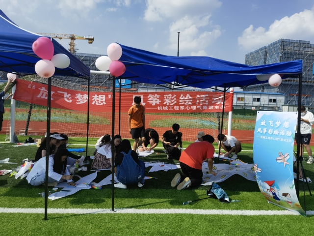 为进一步加强和改进大学生心理健康教育,广泛宣传普及心理健康知识,展现当代大学生奋发蓬勃、积极向上的精神风貌,不断提高大学生心理素质和心理咨询工作水平,营造和谐校园、和谐心灵,丰富大学生的第二课堂,机械工程系心理气象站响应学院大学生健康成长中心的号召和要求,于2022年6月2日下午三点在学校操场举办以“放飞梦想”为主题的风筝彩绘活动。