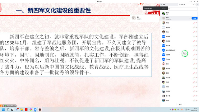此次讲座从两个方面讲解了新四军教育事业建设:首先总体介绍了新四军文化建设的重要性,其次讲解了新四军文化建设的主要内容。