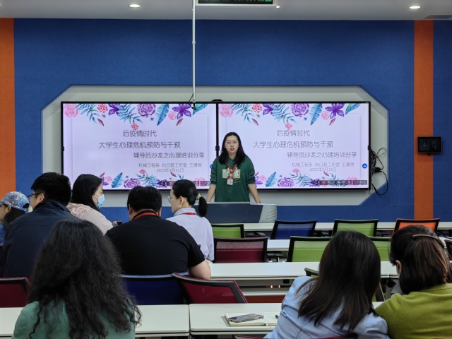 为提升辅导员处理心理危机等相关方面的能力,推进辅导员队伍建设的稳步开展,2023年5月12日,机械工程系专职辅导员王潇然作为主讲人之一,以“向日葵工作室”为依托,在博学楼410参与开展了以“后疫情时代大学生心理危机预防与干预”为主题第十一期辅导员沙龙分享活动。参加此次活动的有大学生健康成长中心副主任龚智俐、各系党支部书记、学生干事及辅导员等40余人。