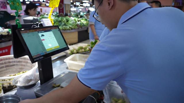 实践团队还前往“刘姐菜篮子”智慧菜场,体验互联网智能化销售新场景。在这里,收银员不用记忆菜品价格,只需将顾客挑选好的蔬菜放上机器,AI智能系统即可自动识别蔬菜种类并生成实时价格单。