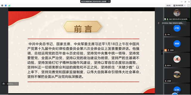4月30日,机械工程系党支部召开政治理论学习会,学习习近平总书记在十九届中央纪委六次全会上的重要讲话和全会精神。机械工程系党支部副书记李杰授课,支部全体党员参加了学习。