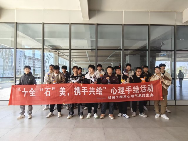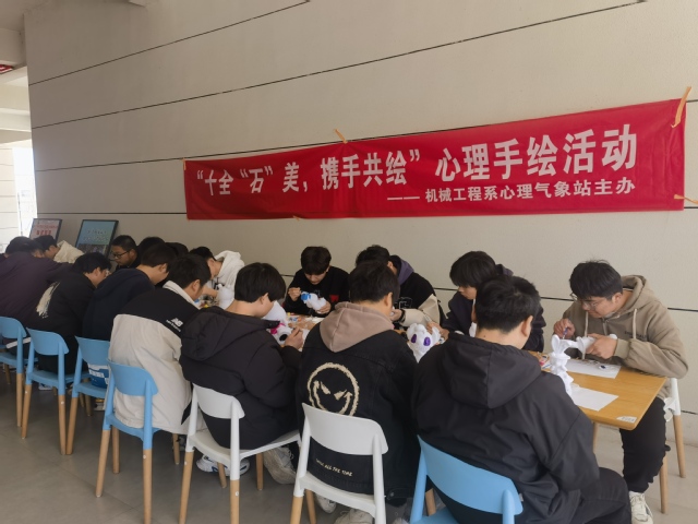 为贯彻落实教育部的《全面加强和改进新时代学生心理健康工作专项行动计划(2023—2025年)》,深入实施关爱青少年生命健康“润心”行动,机械工程系心理气象站结合“五育润心,沐光同行”的主题,于2024年3月20日中午,在食堂前小广场举办了“十全‘石’美,携手共绘”的心理主题活动,吸引了许多学生前来参加。