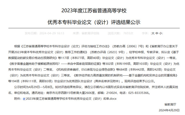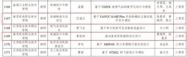 近日,江苏省教育厅公布了2023年度江苏省普通高等学校优秀本专科毕业论文(设计)评定结果,机械工程系机自专业巴城力同学撰写,由陆晨芳、黄晓萍、陈云老师指导的《基于FANUC 0i-MF Plus系统的模拟主轴功能开发与调试》,机制专业景航柯同学撰写,由黄晓萍、陆晨芳老师指导的《滚动直线导轨副的优化设计》,以上均获得省级三等奖荣誉。
