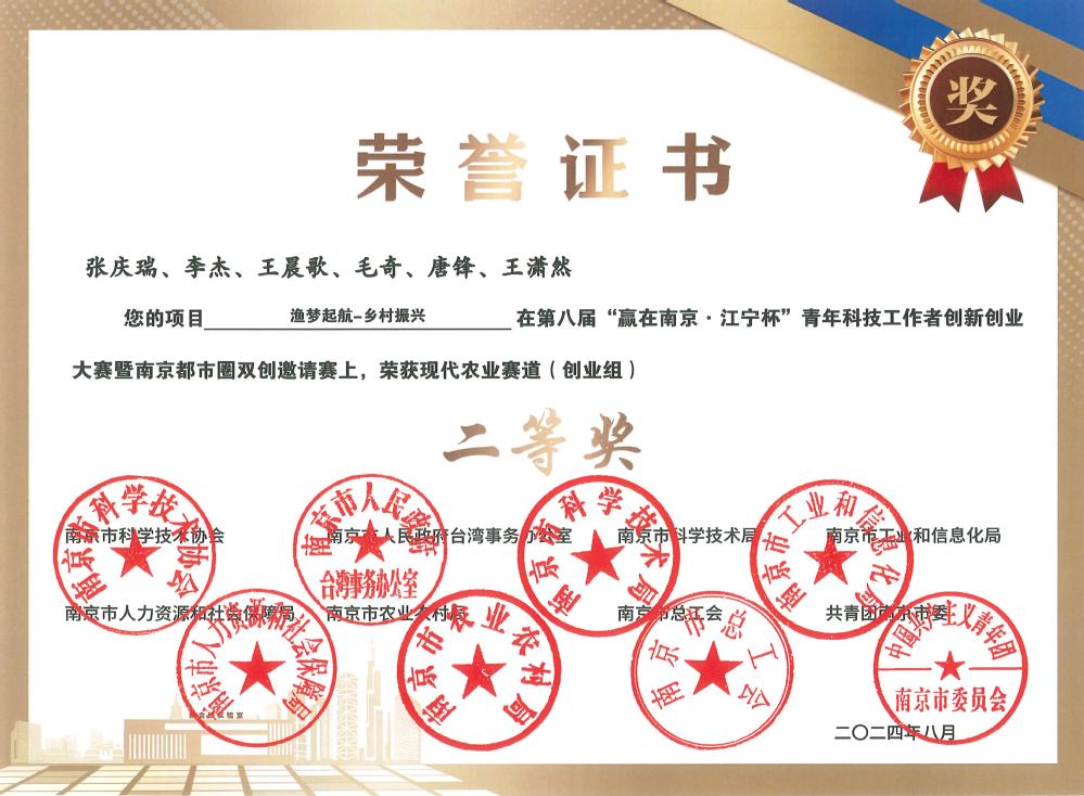 在第八届“赢在南京·江宁杯”青年科技工作者创新创业大赛及南京都市圈双创邀请赛中,我系师生团队——张庆瑞、李杰、王晨歌、毛奇、唐锋、王潇然,凭借其杰出的项目《渔梦起航-乡村振兴》荣获现代农业赛道(创业组)二等奖。