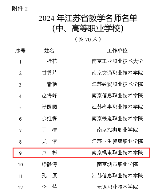 近日,江苏省教育厅公布2024年江苏省教学名师人选名单,经各高校、设区市教育局推荐,以及省教育厅专家的严格评选,我校机械工程系卢彬老师成功入选。