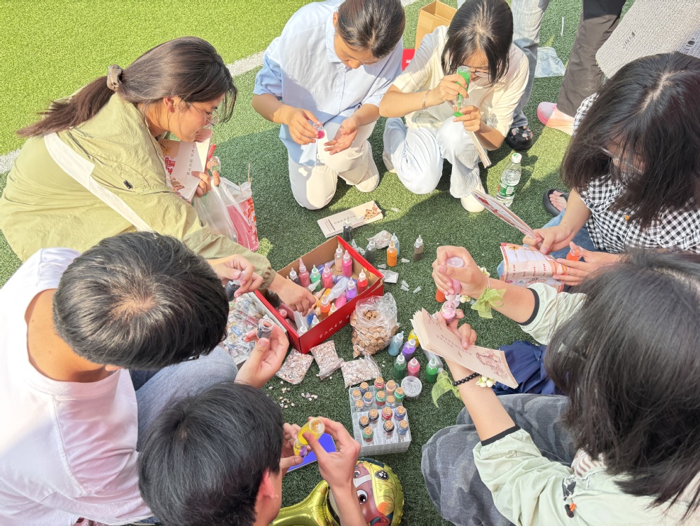 活动以“漂流瓶”为情感载体,通过“人生底牌”心理互动游戏引导参与者探索内心需求,强化自我认知。同学们在游戏中逐步明晰个人价值观,并将心得体会、情感寄语与未来展望书写成笺,辅以彩沙封存于漂流瓶中,完成了一次别具意义的心灵对话。随后的“与‘我’击掌”环节,进一步增强了学生的自我认同感与心理韧性,传递了积极向上的成长信念。