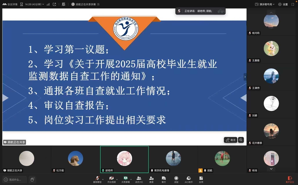 会议伊始,顾航带领全体与会人员共同学习《关于开展2025届高校毕业生就业检测数据自查工作的通知》文件精神,详细汇报了《机械工程系就业工作自查工作方案》的核心内容。结合当前各班自查反馈与系部抽查结果,他重点通报了自查工作中发现的问题,如部分就业材料填写不规范、个别数据更新滞后等,并就问题整改方向提出具体建议。随后,与会人员围绕《机械工程系就业工作自查报告》展开审议,通过充分讨论明确了下一阶段自查工作的细化要求,为确保就业数据真实、准确、完整奠定基础。