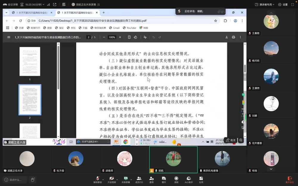 为进一步压实就业育人责任,全面提升就业服务质效,7月19日晚,机械工程系以线上形式召开2025届毕业生就业工作专题会议暨就业监测自查情况汇报会。系主任毛奇、党支部书记胡枫、副主任黄晓萍及2025届毕业班全体辅导员参会,会议由就业干事顾航主持。