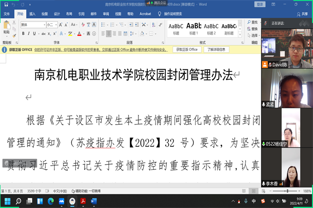 2022年4月11日,为落实江苏省教育厅和学院党委对疫情防控的部署要求,科研及校企合作处李木香处长组织部门全体成员通过腾讯会议认真学习了江苏省《关于设区市发生本土疫情期间强化高校校园封闭管理的通知》和《开云手机官方版页面登录入口校园封闭管理办法》等相关文件。重点强调了强化封闭管理、严格执行健康报告制度、做好返校人员资格审核、强化核酸检测、强化快递外卖管理、加强活动管理、加强个人防护等相关规定。