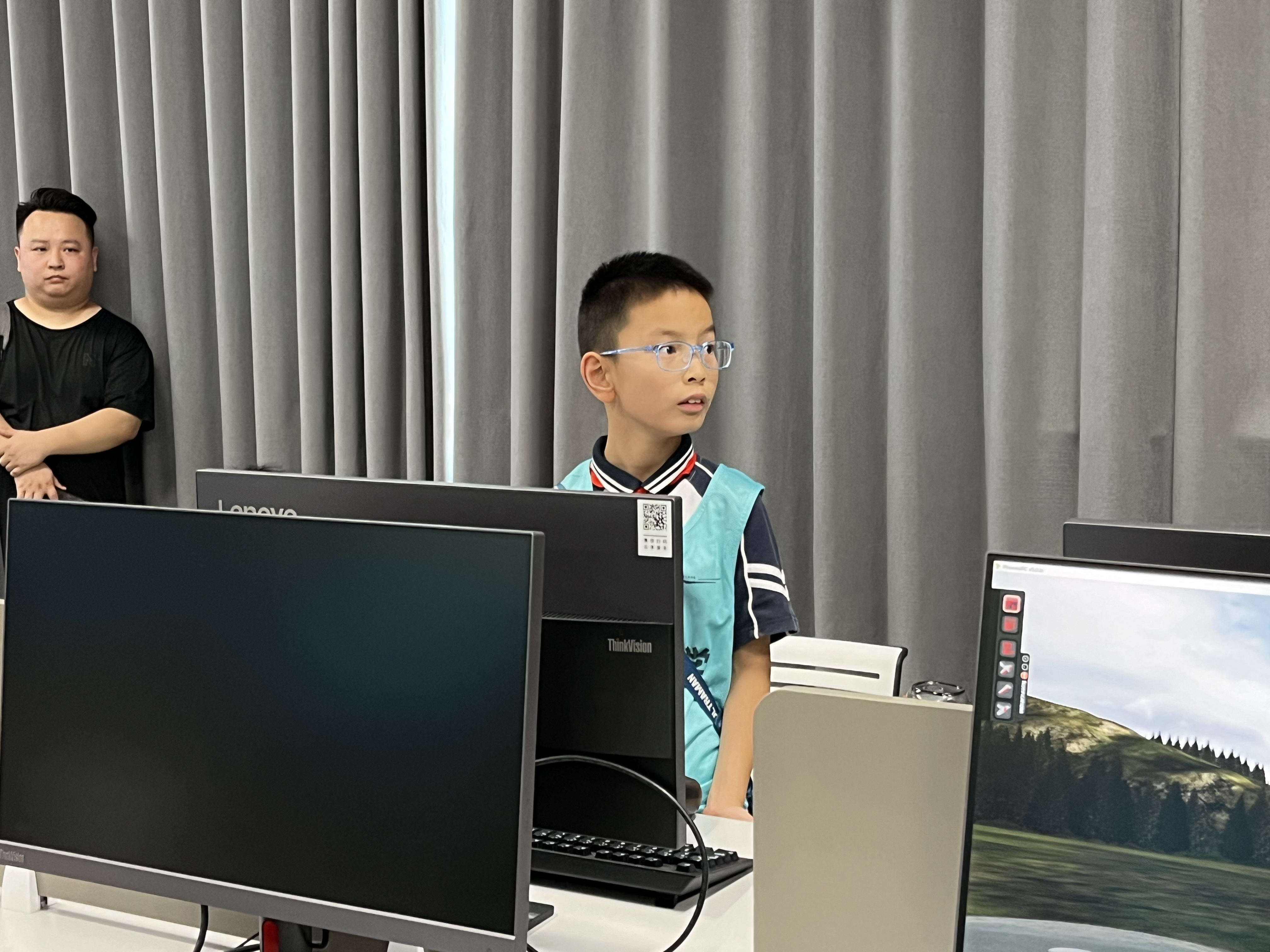 模拟飞行中,同学们先利用无人机模拟飞控软件在电脑上进行模拟飞行,随后在无人机应用技术专业教师顾老师的指导下亲自拿着遥控器进行室内无人机操控练习。刚开始,不少同学在操控无人机时出现了失误,但随着不断练习,部分同学已经可以较为平稳地操控无人机,感受到了满满的成就感。来自南京市高淳区古柏中心小学的两名同学说本次活动让他们感受到亲自实践无人机操控带来的快感。