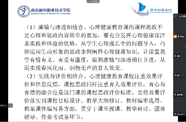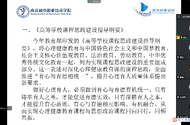 今年教育部印发的《高等学校课程思政建设指导纲要》,将心理健康教育与中国特色社会主义教育、中国梦教育、社会主义核心价值观教育、法治教育、劳动教育、中华优秀传统文化教育一起,列为实现课程思政建设的重要组成部分。为此,蓝岛创客空间创新教研室于11月29日举行“如何做到教育与育心一体化”主题线上研讨会。本次研讨会由蓝岛创客空间黄克瑶老师主持,蓝岛创客空间主任王国珍及创新教研室全体教师参与。