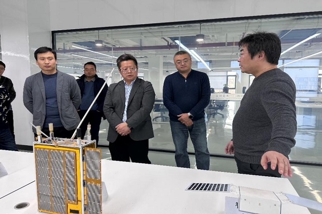 周书记在北京中科睿格董事长兼总经理许璟华的带领下参观了八一08星的基本结构。许璟华对师生们设计和组装的卫星帆板展开实验台、卫星总装实验台、卫星无重力分离实验台、磁力矩器、卫星推进器、卫星反作用飞轮等卫星部件做了通俗易懂、内容详尽的介绍,并就卫星研发工作时间节点做了进一步说明。