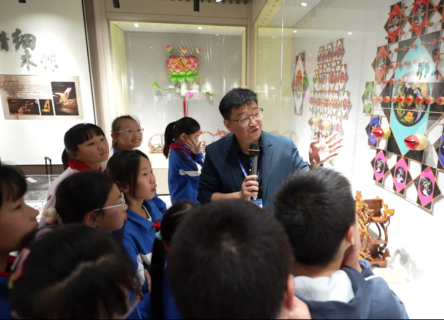 随后,同学们前往二楼的非遗工坊参观。工坊内,丰富多样的非遗项目展示令人目不暇接。南通板鹞风筝、秦淮花灯、扬州精细木作等极具地域特色和文化价值的传统技艺呈现在大家面前。值得一提的是,通过多媒体互动大屏和互动体验的方式,学生们得以更直观地了解这些非遗项目背后的历史故事和文化内涵。他们或是驻足观看大屏上的介绍,或是亲身体验传统技艺的独特魅力,沉浸其中,对传统文化瑰宝有了全新的认识和深刻的理解。