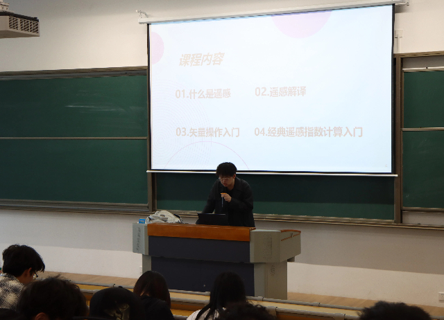 4月16日,由工程师彭芝珏主讲卫星遥感数据应用专题实践。首先,彭芝珏给卫星班的同学开展遥感数据应用专题授课,他从什么是遥感、遥感解译、矢量操作入门、经典遥感指数计算入门深入浅出地介绍了卫星遥感系统的组成、数据获取方式以及常见的数据格式。