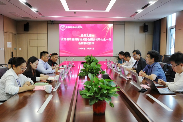 10月11日,江苏省教育国际交流协会副会长冯大生,江苏省高职研究会会长、江苏经贸职业技术学院总督学、原院长薛茂云,中国教育在线国际交流中心主任孙志鑫,中国教育在线江苏公司总经理张兴雷等一行领导莅临我校指导工作。本次交流座谈会主题为“新双高”建设背景下南京机电职教出海的路径探索,学校党委书记、校长周庆礼,党委委员、纪委书记、工会主席姜振宇,继续教育学院副院长、培训处副处长周云龙,继续教育学院国际交流中心主任石琳婕出席本次座谈会。