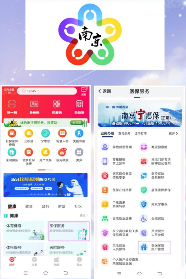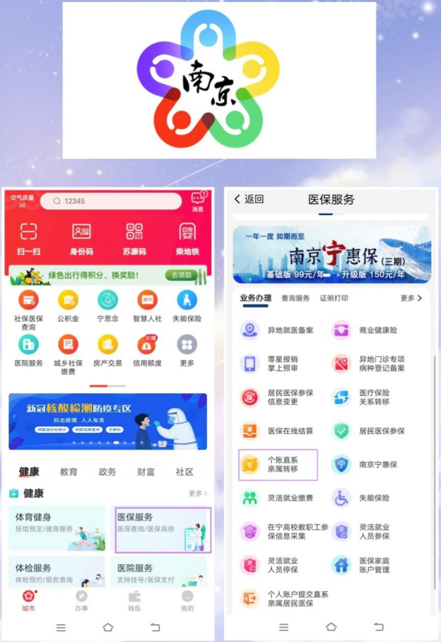 (1)渠道1:双方都参加职工医保。参保人员可以通过“我的南京手机app——医保服务——个账直系亲属转移”实现账户余额的互相转移,共济使用。