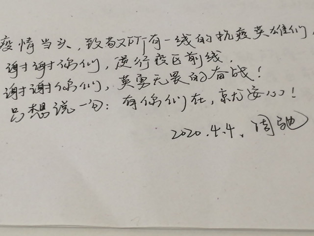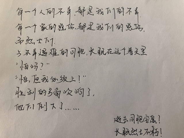 清明追思、家国永念。为表达对抗击新冠肺炎疫情斗争牺牲烈士和逝世同胞的深切哀悼,学生会全体成员手写哀思。“向逝去的同胞告别!向牺牲的英雄致敬!愿你们一路走好,愿天堂永没有疫情。逝者安息,精神长存。我们只是困在家里面两个月,但有些人永远地困在了冬天。不忘记战士,不忘记过往,逝去的英雄永远停留在人民的心中……”