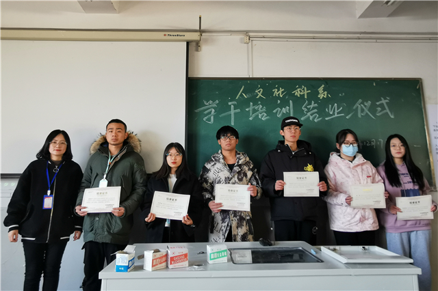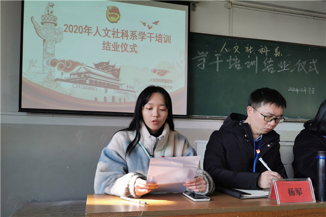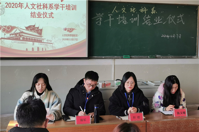 12月17日中午,人文社科系学生干部培训结业仪式在知行楼311举行,全系一百余参培学员参加结业仪式。人文社科系党支部副书记叶绘、系团总支书记杨军、系学工干事张文婷、系心理气象站站长陈文继老师出席结业仪式。结业仪式由人文社科系团总支秘书长范雨亭同学主持。