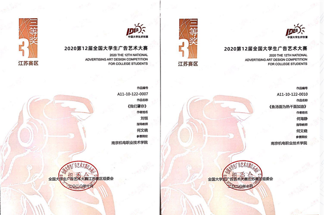 2020年人文社科系艺术设计类专业在各级各类专业竞赛、创新创业类中,取得了不错的成绩,其中获得全国二等奖一项、江苏省二等奖(银奖)两项、三等奖(铜奖)五项。近年来,系部紧抓专业建设,重视艺术设计类学生作品的质量提升,在全国高校数字艺术设计大赛、全国大学生广告艺术大赛等赛事上取得了突破性进展。